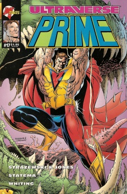 The third issue was oddly eerie after the first two. After a flashback to a transformation he had before the first issue, Kevin finds himself at the lab of Dr. Gross, the scientist responsible for his transformation, and Duey, Gross' assistant "son" who received the same treatment as Kevin, only because Gross hadn't perfected his experiments yet he turns into a grotesque ogre-thing with little arms all over his body, like those frogs with trematodes. In a fit of confusion, Prime escapes and accidentally mortally wounds Dr. Gross in the process, forcing Gross into a Prime-like body of his own. While trying to seek help from a well-known hero named Hardcase, Prime gets into a fight with Prototype, another Ultraverse character who's basically Iron Man with a different color scheme.