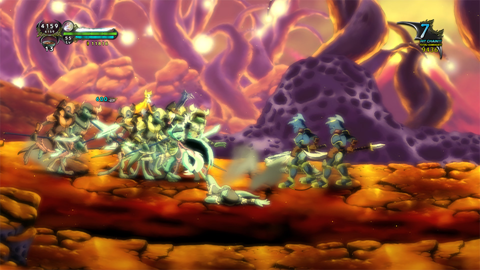 There is some cute dialogue outside of the main story, and I got a little choked up at the end of the scenario with the mushroom people, but by the end of the game I was getting enraged by the flip-flopping as to whether Dust is this guy or that guy or both or neither, and this one character insists he's the one guy and Dust says he isn't, then when that character decides Dust really isn't the one character after all Dust says yes he is and then Dust dies in the volcano, but then maybe he's still alive and oh my god, make up your fucking mind, game.