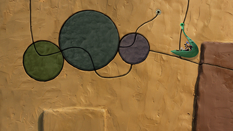 And remember those sections in Neverhood where you rode a buggy along a track in the wall? You know, the worst thing about that game after the Hall of Records? Well, they're back in Armikrog and even more a pain in the ass because the buggy doesn't understand intersections. To illustrate what I mean, take this image, pretend the purple disc is solved, and imagine you're trying to get onto it. While trying to cross over, the buggy will bounce off the intersection several times before finally making the cross. And navigating that entire path means five instances of the damn thing struggling against broken programming.