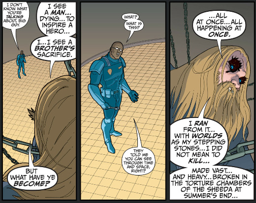 There are multiple ways to look at this book. You can see it as a middle ground between Batman: The Return of Bruce Wayne's personal exploration of Batman and The Multiversity's multiverse-spanning crossover as Morrison teams up with various artists to explore a trope he likes (in fact, Klarion's issues are drawn by the same artist as the witch hunter issue of Return of Bruce Wayne, Frazer Irving), just with a focus on order from chaos instead of alternate realities. If you wanted to be wanky you can see it as an exploration of the Dreamtime and how the ripples we create affect the lives of other in ways we'll never know about. Or you can just see it as Morrison finding an excuse to give five or six forgotten characters (again, Zatanna's pretty well-known compared to the rest of the Seven Soldiers, and even Mister Miracle is above the likes of the Guardian) a chance in the spotlight.