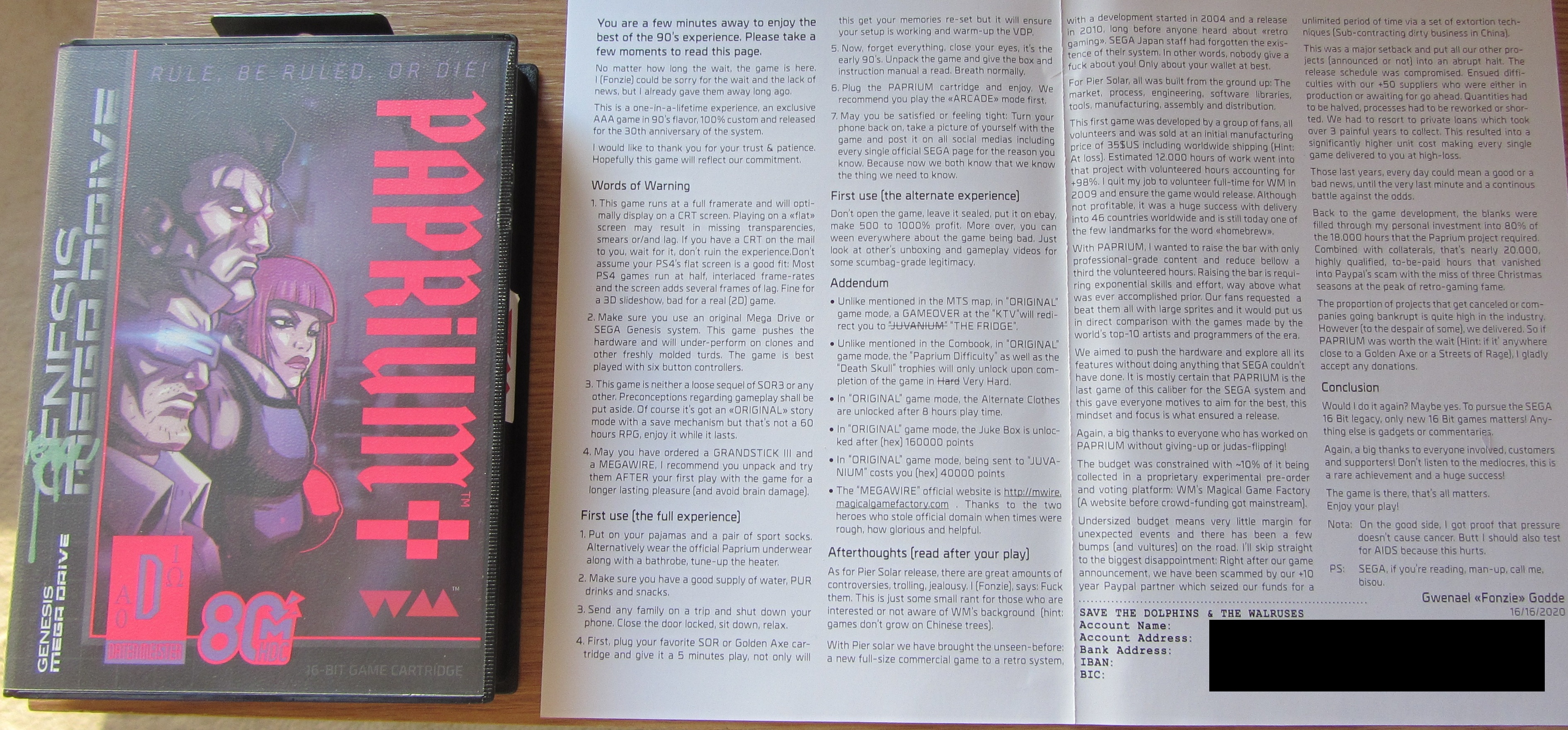 Word recently dropped that WaterMelon is considering releasing a version of Paprium people can put onto MegaSD flash carts, using some kind of DRM that ties the ROM to a given cart's serial number. Y'know, if Fonzie would just release the game on Steam and make it easier to legitimately play he wouldn't have to be so paranoid about people pirating the game; just critically mauling it and mocking the stolen artwork.