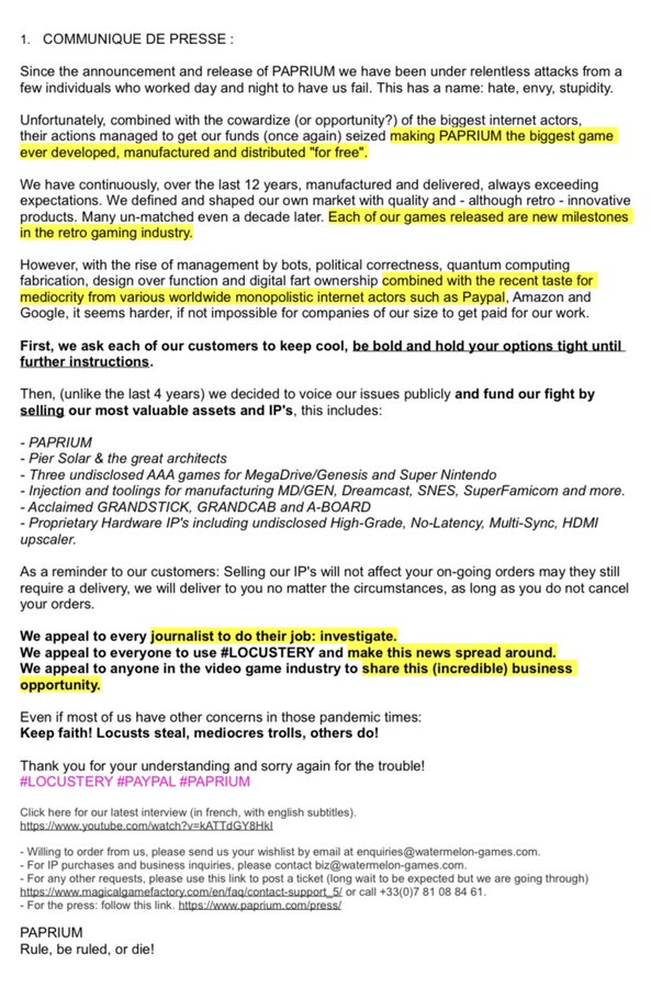 I had no idea what a dumpster fire the actual development was until I was introduced to @Paprium_Fiasco, a Twitter account documenting the whole, well, fiasco. Skimming through the Paprium Fiasco blog showcases a rabbit hole of mismanagement, delays, corporate and financial talk that's over my head, several people leaving WaterMelon including Mr. SNES-is-8-Bit himself, and a release party that was held two years before the actual release and showcased what could charitably be called a beta build. WaterMelon pissed around so long Streets of Rage 4 came along and torpedoed whatever reason Paprium had to exist. But come December 2020 people finally started getting it along with this batshit bonkers rant from the man leading the show, who goes by the moniker "Fonzie."